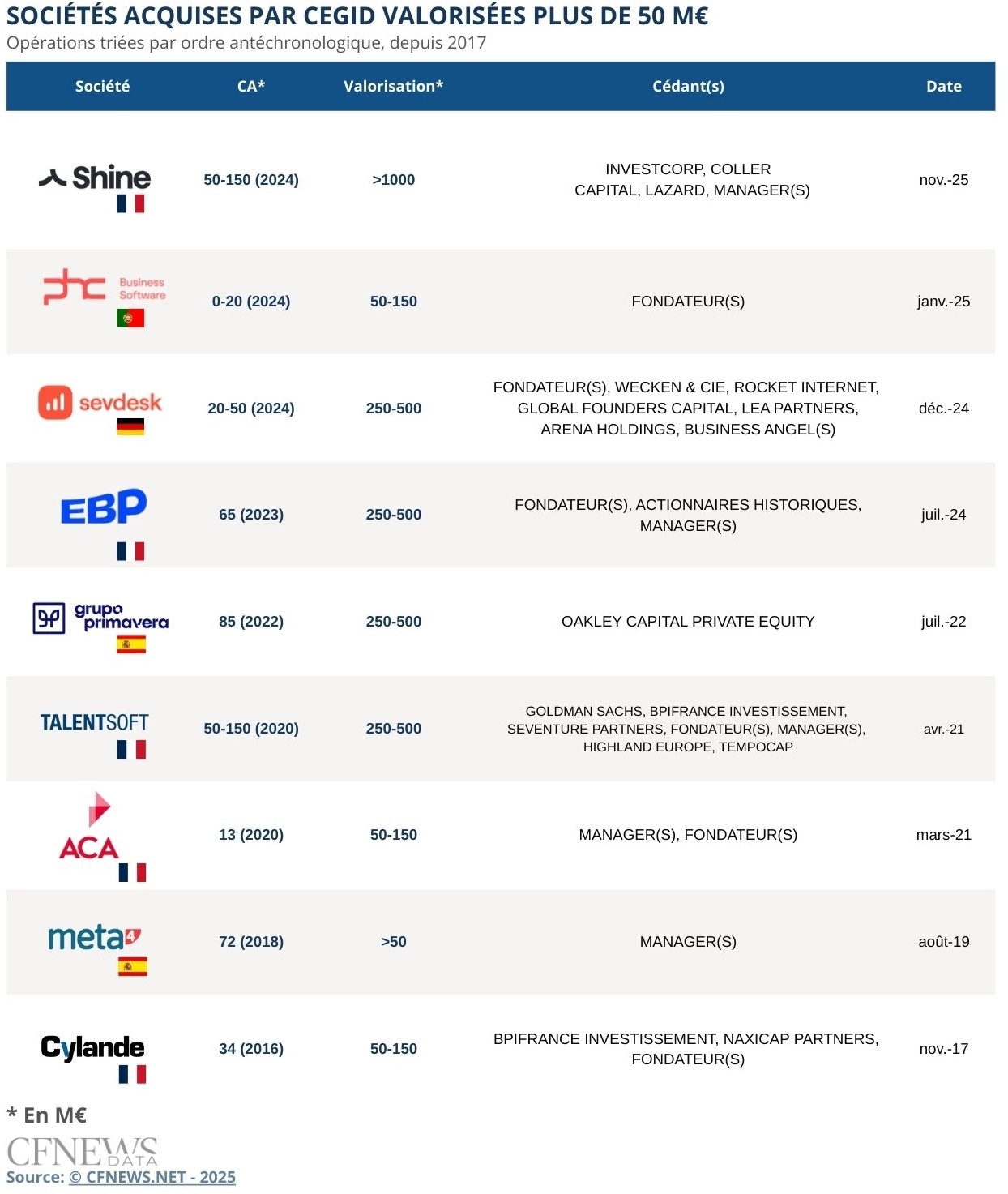 Shine (ex-Ageras), salariant 400 personnes, génère 100 M€ de chiffre d'affaires. La société compte 420 000 clients, des TPE, des professionnels indépendants et 15 000 experts-comptables, dont 260 000 en France. Cegid, détenu par Silver Lake, AltaOne, KKR et Oakley Capital, complète ainsi son offre avec une brique de paiement. En plus de l'Hexagone, il se renforce en Espagne, au Portugal, aux Pays-Bas, en Belgique, en Allemagne et au Danemark. Sa dernière acquisition, du portugais PHC Business Software, remontait au début de l'année. Fort de plus de 5 000 salariés, l'éditeur générant 967 M€ de revenus en 2024 prévoit toujours d'atteindre 1,3 Md€ de chiffre d'affaires l'année prochaine dans le cadre de son plan Forward 2026.